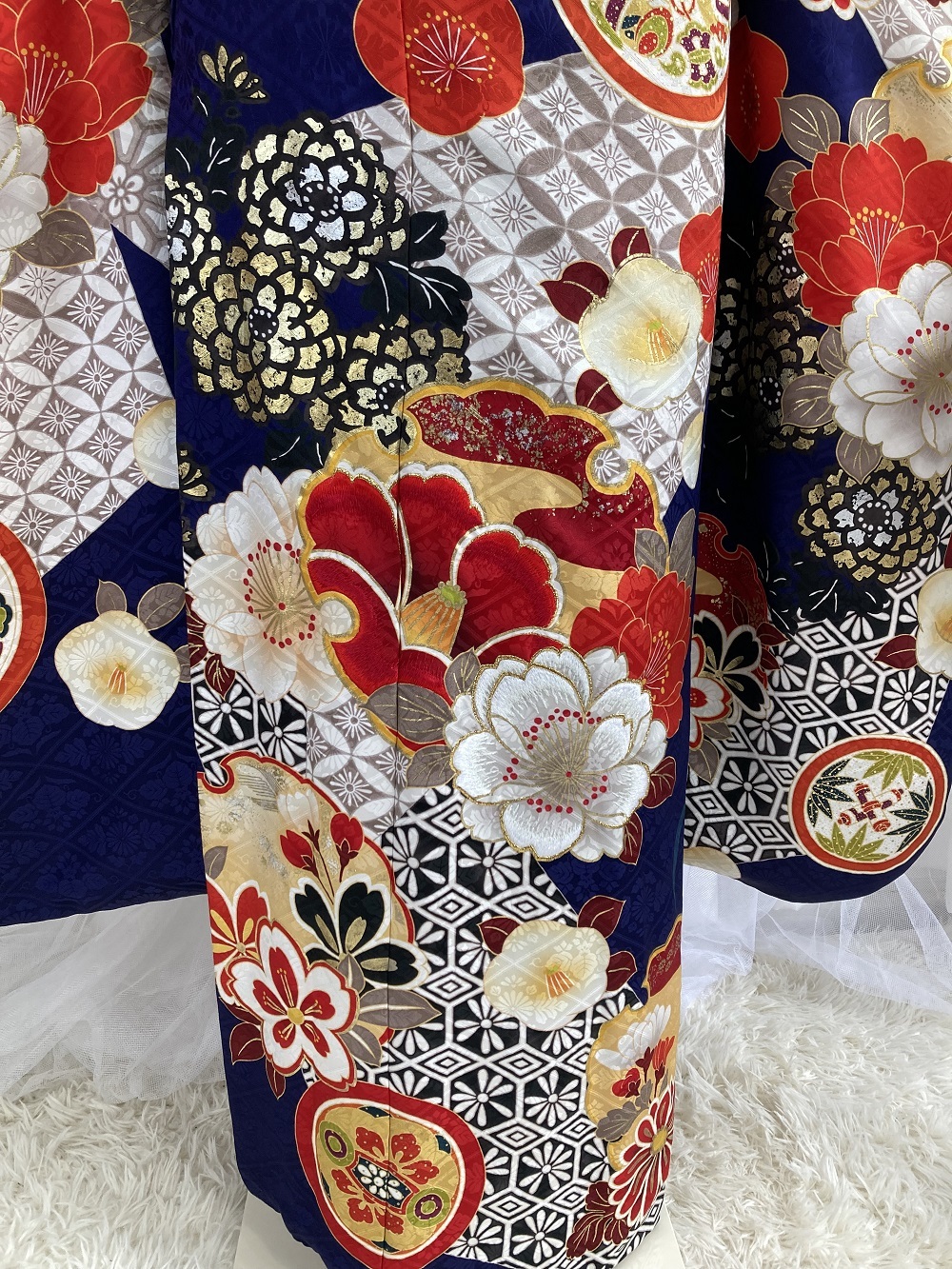 落ち着いた紺色のお振袖に花と白の花模様が豪華で上品です。髪飾りに赤か白の椿を付けたらとても素敵!